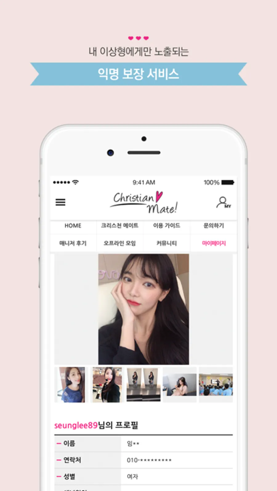 아무나 볼 수 없습니다. 극 소수의 이상형에 속한 회원에 한하여 소개드리기에 노출은 조금도 걱정하지 않으셔도 되며, 이상형 회원에게도 이름,연락처,교회명,지역등은 블라인드 처리되서 소개됩니다.