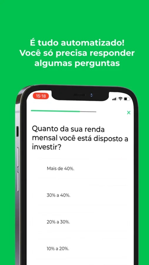 Você responde poucas perguntas e a nossa tecnologia alimentada pelo conhecimento de especialistas cria uma carteira de investimentos diversificados em ações brasileiras, ações globais, ações americanas, ações de empresas de tecnologia, renda fixa privada, renda fixa pública e outros.