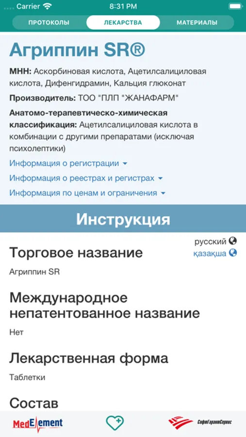 - Раздел "Лекарственные средства". В нем представлены описания препаратов, зарегистрированных на территории Таможенного союза ЕАЭС, и инструкции к ним.
