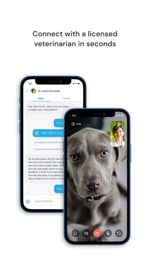 The video call functionality lets the veterinarian and the animal owner see and talk to each other, and a switch camera button lets the animal owner show the veterinarian the animal and its environment.