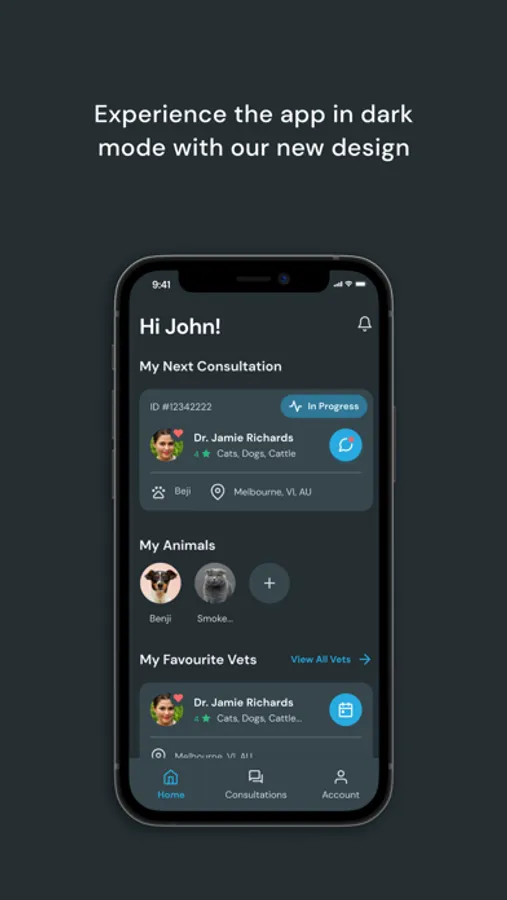 • The veterinarian will accept your request and send you a notification (notifications must be enabled in the phone’s settings). You’ll be able to see the veterinarian’s name, location and area of expertise.