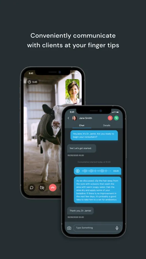 The smartphone camera lets the veterinarian and the animal owner see and talk to each other. The rear camera switch on the app lets the owner show the veterinarian the animal and its environment. A visible timer counts down the 15 minutes and then cuts the tele-videoconferencing session. After the session the veterinarian can send a text message via the app to provide follow up information to the animal owner.