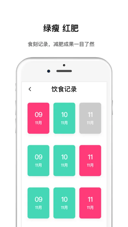 每日饮食记录卡路里消耗量大于卡路里摄入量显示绿色,卡路里消耗量小于卡路里摄入量则显示红色,你每天体内的热量在聚集还是在燃烧一目了然,让减肥每天的变化看的见。