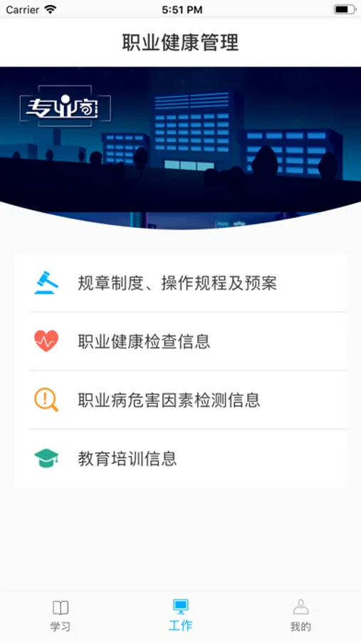 配合公司相关软件,提供企业职业卫生健康管理的相关功能,协助企业更好的信息化管理;软件由智慧职安环保科技有限公司提供,详细可以访问专业家云平台www.51zyj.com,可搜索微信服务号“zhuanyejia”进行关注。