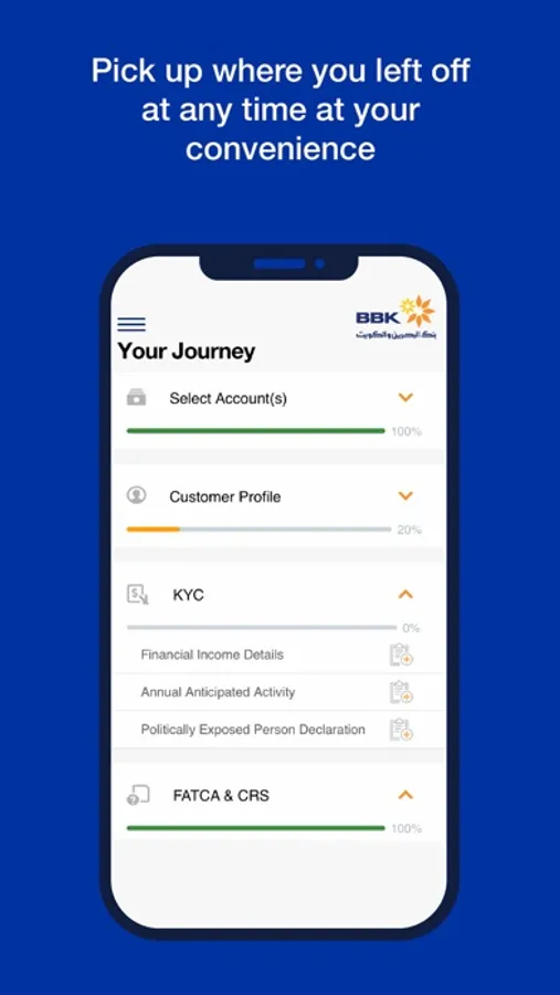 BBKPLUS Mobile Application allows you to open accounts conveniently and securely while on the go. It is available for BBK customers and non-BBK customers residing in the Kingdom of Bahrain.