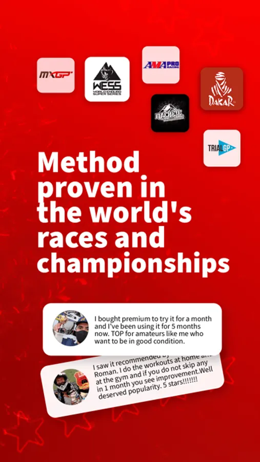 Achieve your goals and needs with our exclusive algorithm. Now, you can combine your workouts with our motocross program at home or with your bike. Train hard for the next visit to the circuit or riding day with your bike.