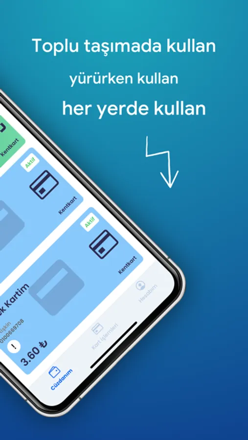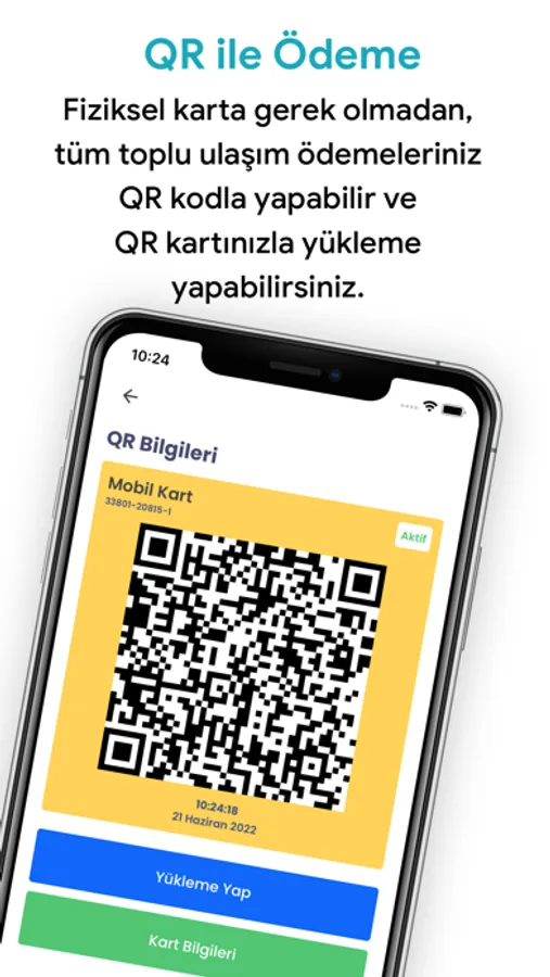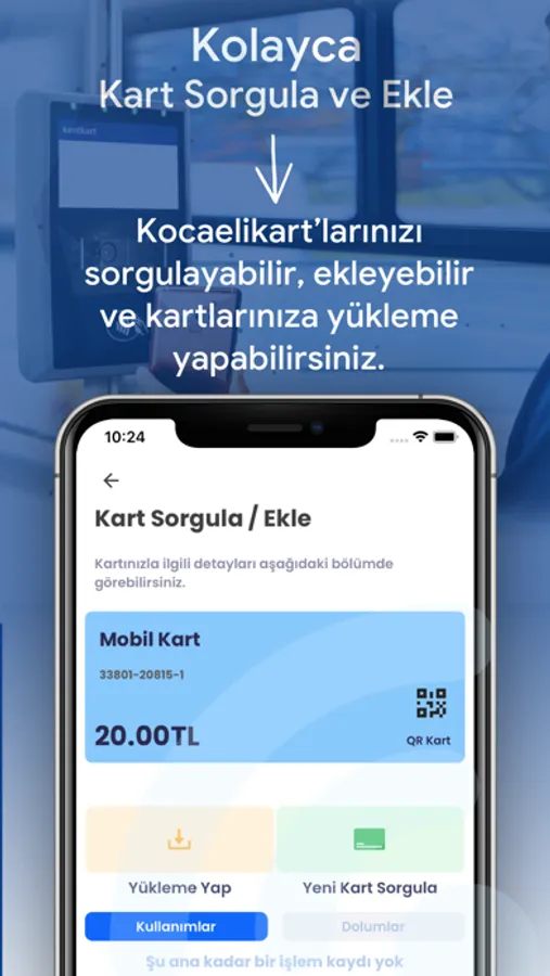 • Mobil Kart satın alabilir ve uygulamanızı kullanarak toplu taşımada sadece QR kodunuzu göstererek ulaşım ödemelerinizi kolayca yapabilir ve bunları tek bir uygulama içinde gerçekleştirebilirsiniz.