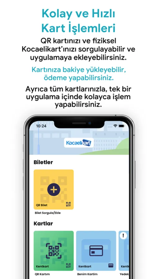 Kocaeli Kart Cüzdan ile artık kolayca hem Kocaeli Kart’larınıza hem de Mobil Kart’ınıza bakiye yükleyebilir, bakiyenizi görebilir, QR kodla ödeme yapabileceğiniz Mobil Kart’ınızı satın alabilir ve fiziksel kartınız yanınızda olmasa bile uygulamanızı kullanarak toplu taşımada sadece QR kodunuzu göstererek ulaşım ödemelerinizi kolayca yapabilirsiniz.