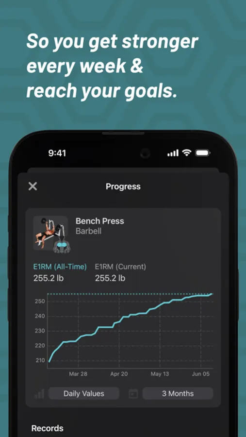 After each workout and week, you will receive a detailed progress analysis, showing how long you trained, how much weight you moved in total, and which exercises you have improved or set new personal records on.