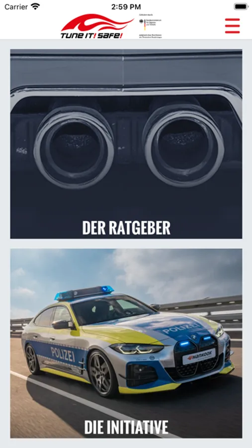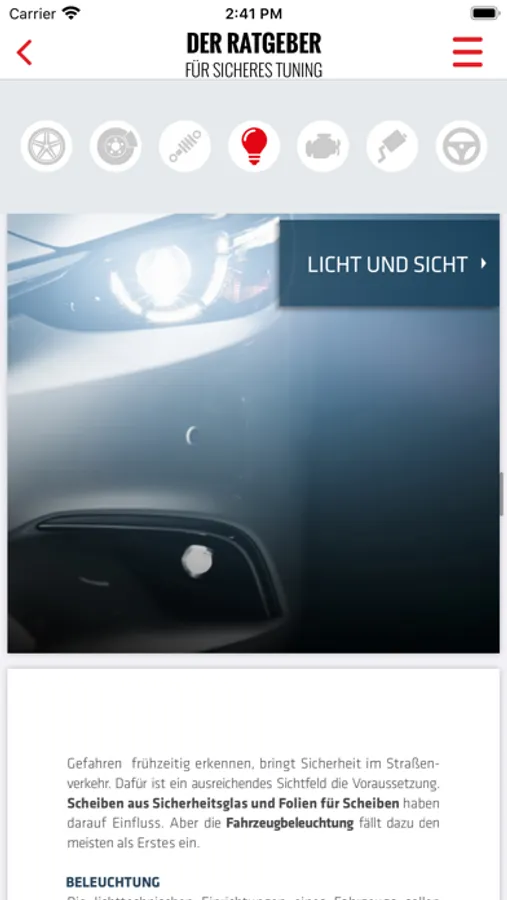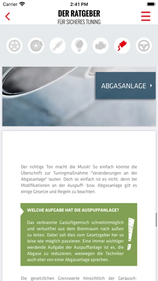 Mit dem Ratgeber für sicheres Tuning bietet die App ein großes Tuning-Lexikon zu allen relevanten Veränderungsmaßnahmen am Fahrzeug. Ob Räder und Reifen, Fahrwerke, Bremsen, Licht und Sicht, Anbauteile, Motor, Abgasanlage oder Interieur – der Tuning-Ratgeber geht auch alle Themen und Maßnahmen ein. Dazu gibt es einen Einblick in Nachweise und Regeln, Polizei-Tipps und es wird auf die gegenseitige Beeinflussung eingegangen.