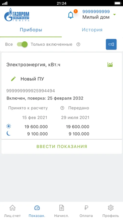 2) на странице "Показания" для передачи показаний выберите нужный прибор учета, нажмите "Ввести показания", далее введите показания и нажмите "Отправить" (прием показаний осуществляется с 1 по 25 число месяца).