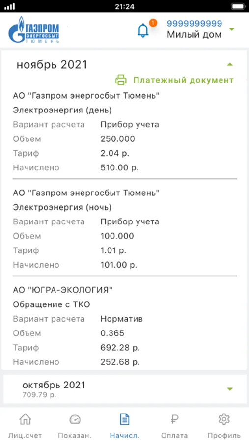 5) в разделе «Начисления» можно ознакомиться с историей начислений и платежным документом (квитанцией) за любой расчетный период предыдущих трех лет.