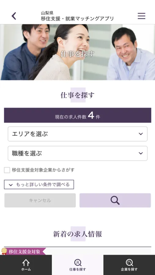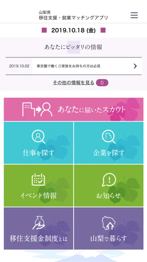 山梨県内の求人情報を掲載し、山梨県へ移住する際の求人検索を支援します。希望する求人情報の条件を登録しておくことで、該当する求人が登録されるとプッシュ通知が届きます