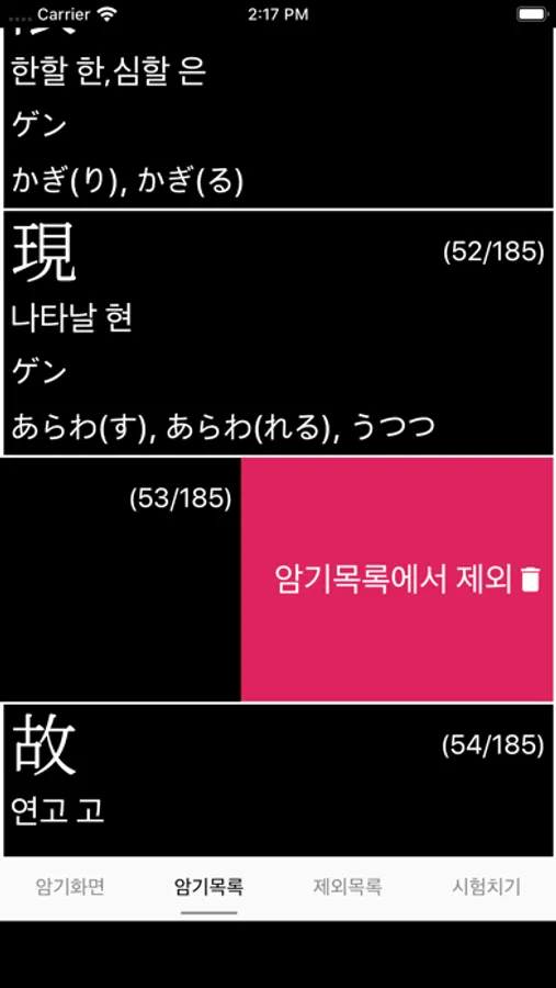 목록에서 아이템을 왼쪽으로 밀면 해당 목록에서 제외되고 암기 화면은 암기목록의 한자들이 표시됩니다.