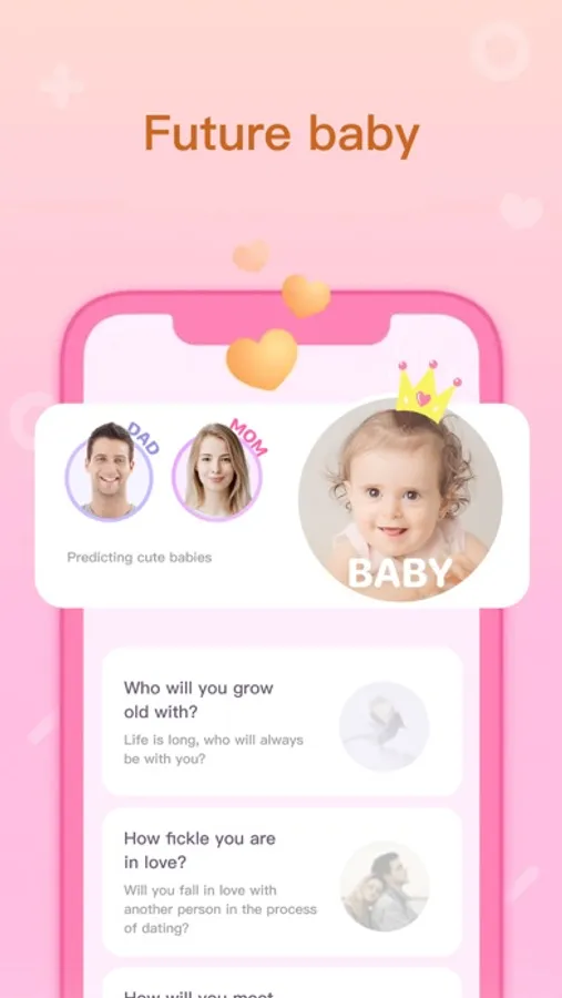 Do you want to know what your baby looks like? If you want to predict your cute baby in the future, just upload a photo of you and your partner, and select the baby's gender, and then you can see the baby's photo.