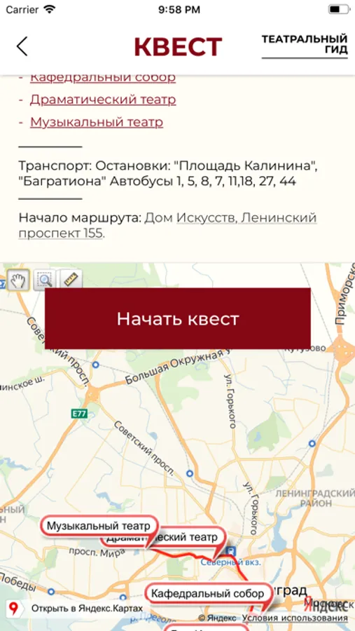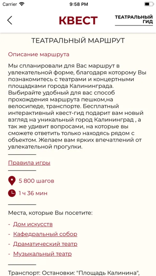 Бесплатное мобильное приложение «Театральный гид» предназначено для вас, гостей и жителей Калининградской области. Это ваш персональный рекомендательный сервис, интерактивный навигатор по всем театрам, учреждениям культуры Калининграда и Калининградской области.