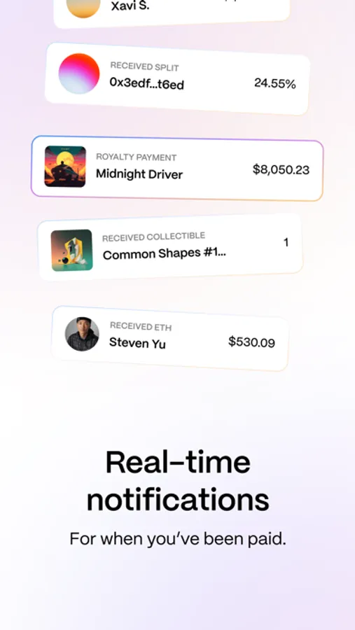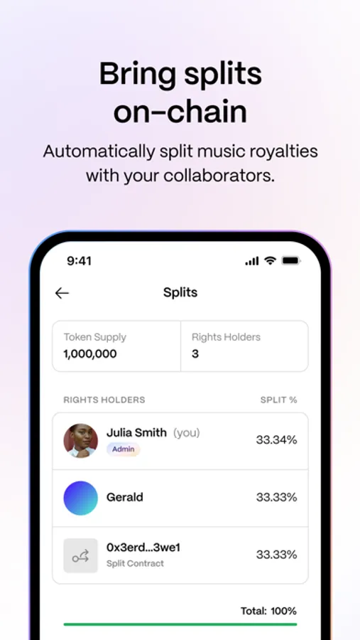 → Create split contracts for splitting payments from Royalty Tokens, NFT sales and other web3 sources between multiple parties