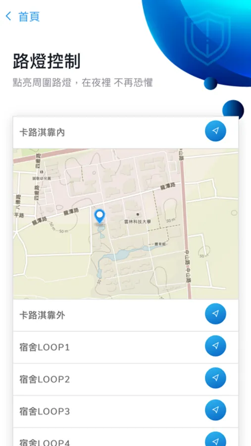 因應寬廣校園,師生研究夜歸需求,考量智慧節能,擬依照師生夜間動線需求,於校園規劃安全路徑,利用Beacon(手機藍芽定位),即時偵測師生隨身手機訊號,點滅該區路徑路燈,突發狀況時,師生可即時操作手機緊急求救,APP發出定位訊號。