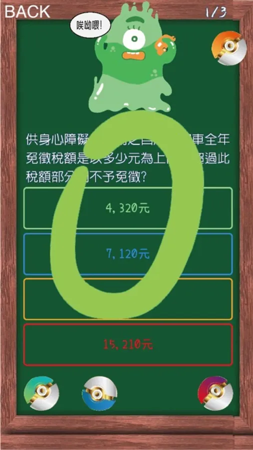 遊戲有5個怪獸關卡,包括房屋稅、土地稅、牌照稅、納保法、發票及行動支付5關,每個關卡有3個題目,玩家將正確答案顏色之寶貝球丟中怪獸,5個關卡都完成,即算成功,玩家可不限次數參加,每週選出完成速度最快前5名玩家致贈500元禮券。