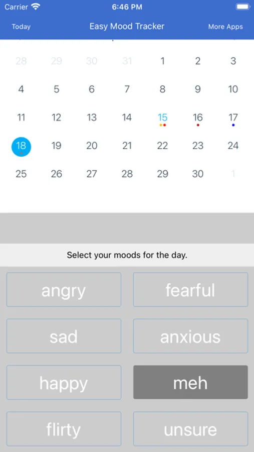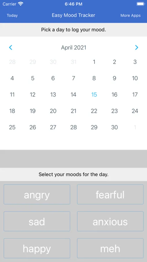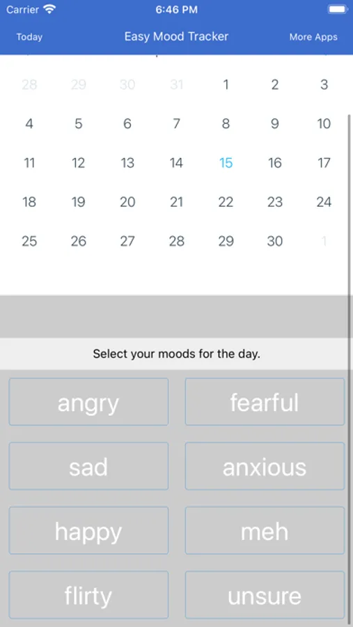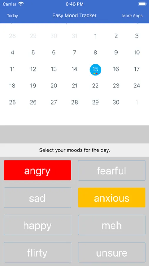 Improving one's mood and emotional health requires knowing what you've felt in the past. Easy Mood does just that. Track all of your feelings from day to day using a simple but familiar calendar interface. Get a quick view of each emotion for each day in a month. Each emotion has a unique color so you can easily identify and track which days you have felt each emotion.