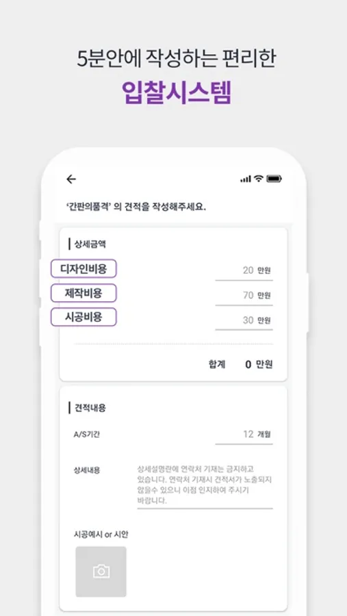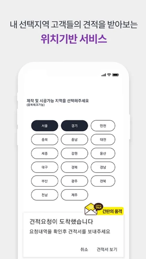 - 실시간 견적 관리 : 고객의 의뢰 내용을 시간과 장소 구애없이 스마트폰으로 쉽게 확인하고 견적서를 발송할 수 있습니다.