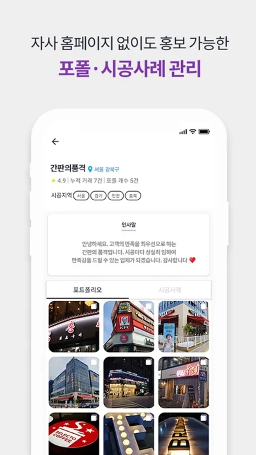- 포트폴리오 및 시공 사례 관리 : 포트폴리오를 통해 파트너사의 노하우를 홍보할 수 있고, 고객과 매칭 시 시공 사례 관리 및 고객 피드백을 받을 수 있습니다.