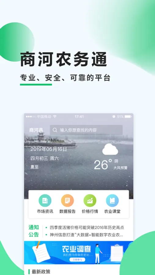 商河农务通平台可以实现实现气象服务、日历、价格行情、问问专家、政策公示、补贴查询、市场行情等各模块的数据分析及搜集,实现“从数据到展示”全方面的数据统计、展示。有效解决了政府和涉农单位之间的沟通障碍。