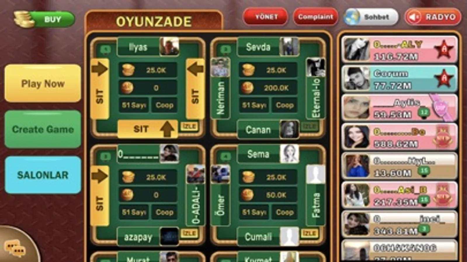 You can join either with your facebook account or your oyunzade.com account. You can widen your social network while playing our game. You can choose which saloon to play the game. You can choose to open table option and invite your friends to the table. You can have private chat with your friends.