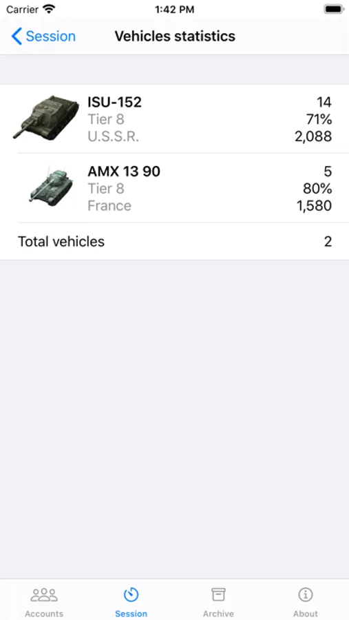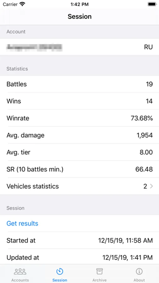 Do you play World of Tanks Blitz? If so, then you are most likely interested in your game statistics. There are a lot of tools to track statistics for account (such as our wblitz.net website), but BlitzSession application offers you to track statistics for a certain period of time - the game session. Just add your account, tap "Start new session" and play the game. When you are ready, tap "Get results" and you'll see the main indicators: amount of battles, winrate, average damage, average tier, SR (session rating), and statistics for each vehicle that you played. If you want to start over, tap "End session". This would save your results to archive.