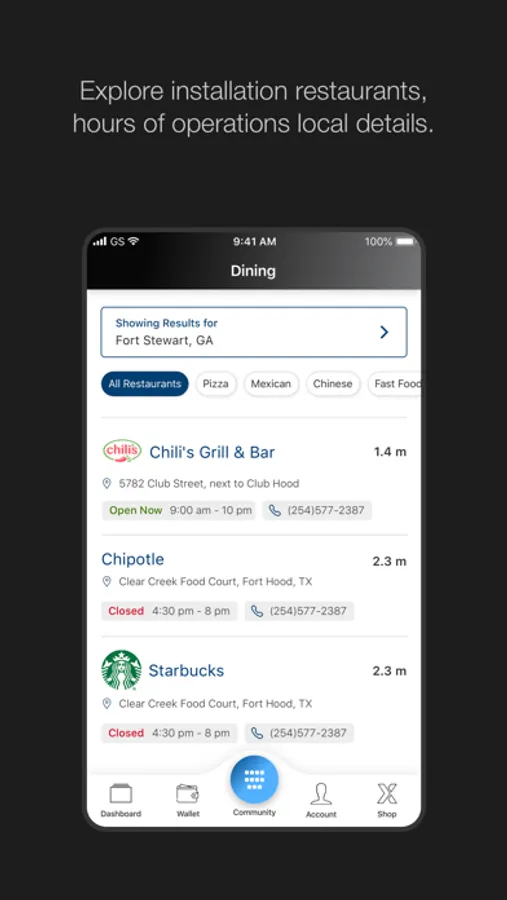 Explore all the benefits your Army post has to offer; such as restaurants, events, shops, clinics, activity centers, and directorates. Navigate to on-post facilities, stay updated on local weather, and be informed about gate closures or other important installation information in real time, all from the palm of your hand.