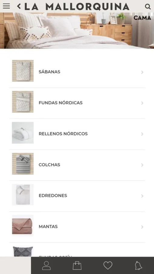 En la categoría de cama tienes todo lo necesario para vestir tus dormitorios: sábanas y fundas nórdicas en colores lisos o estampados, edredones nórdicos, colchas de punto y piqué, mantas, fundas de cojín y almohadas.