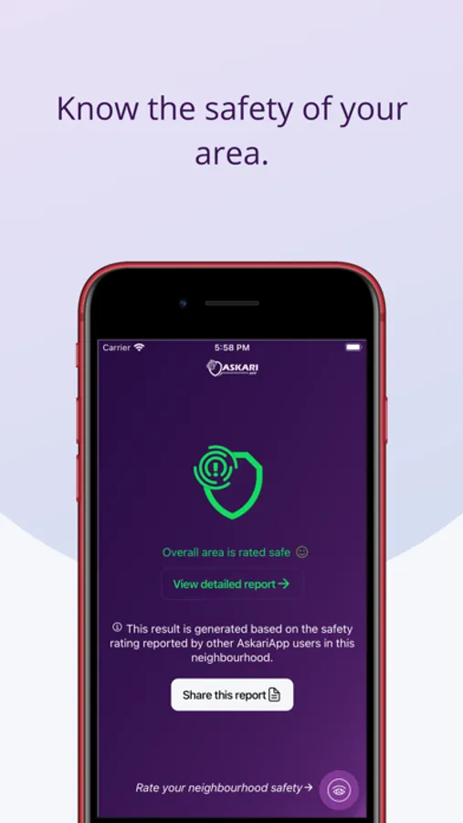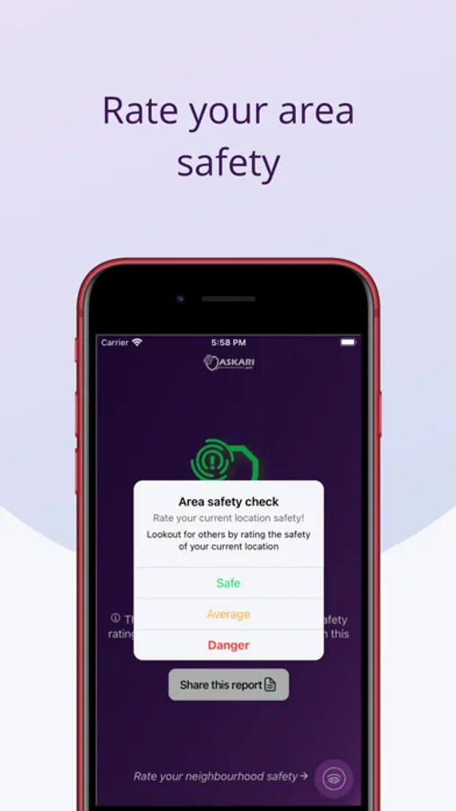 The askariapp allows you to know the overall safety of your area as reported by different users of the askariapp in your neighborhood. The askariapp will send you a crime alert whenever you enter a potentially unsafe area.