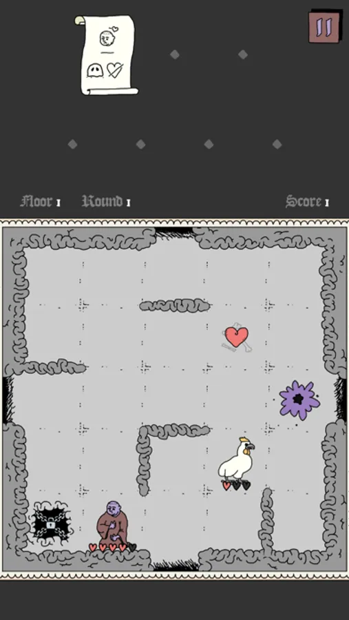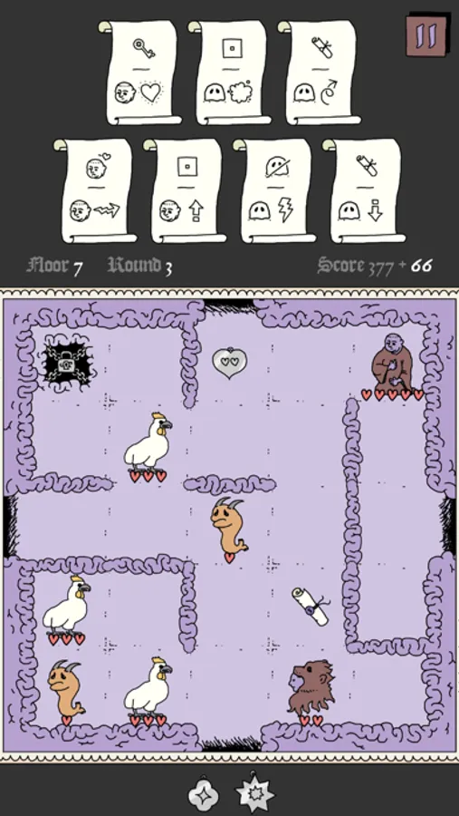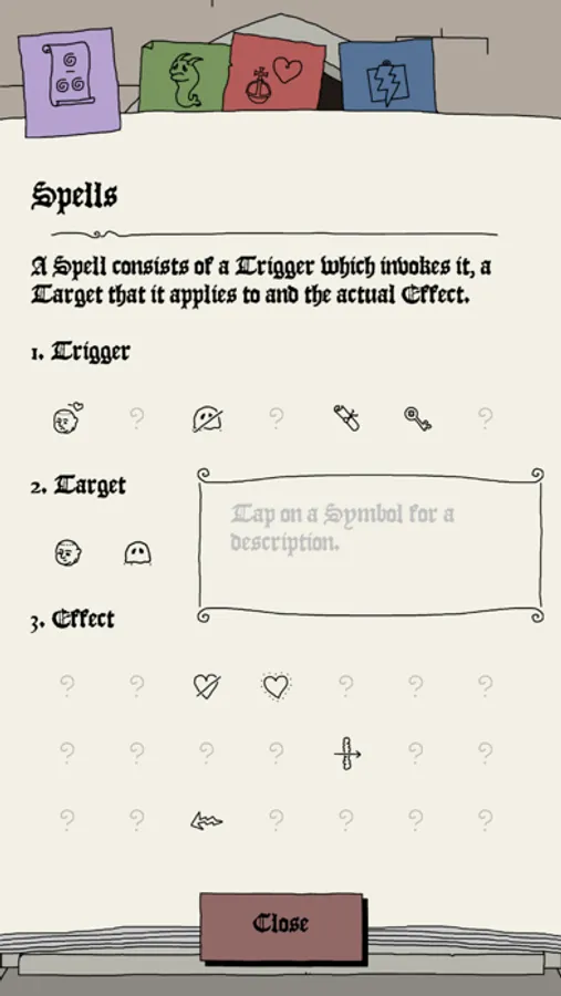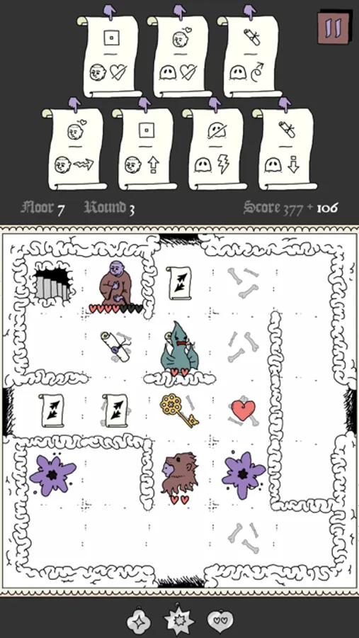 Collect up to 7 scrolls, each with a unique combination of symbols. Scrolls are triggered by actions in the game, as indicated by the first symbol (the "trigger"). They can affect either the Monk or one of the Monsters.