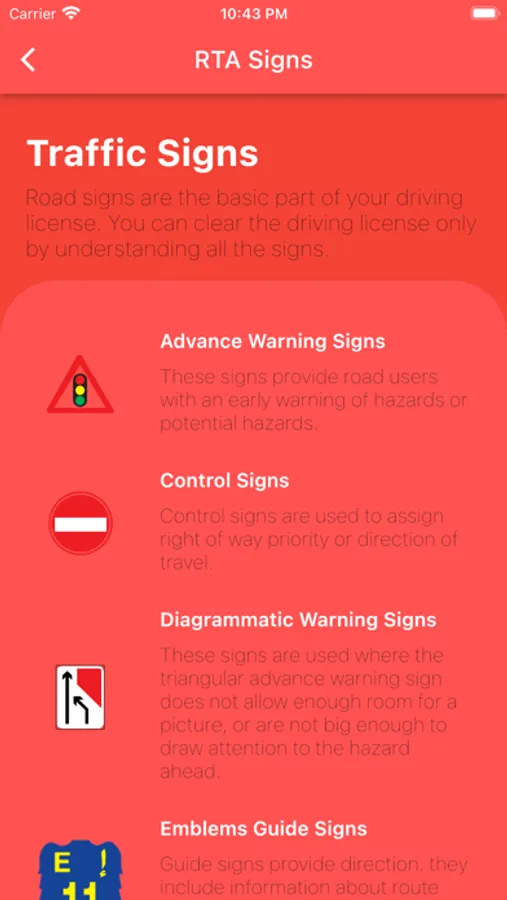 RTA Signal Test اشارات السير app offers you all the traffic signs that you need to understand to pass your practical test. You can learn about all the traffic signs. There is a detailed description of every sign. Once you go through traffic signs then try rta signal test practice.