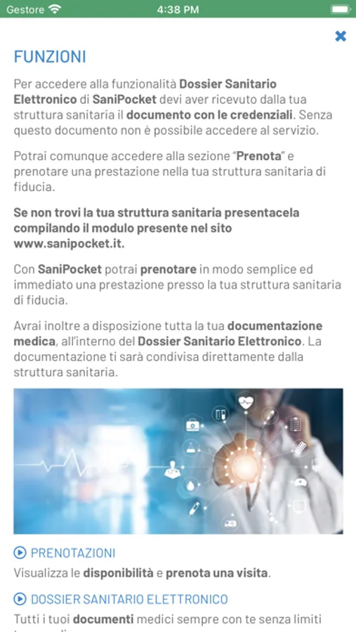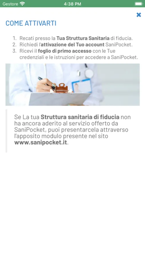 Per utilizzare SaniPocket devi aver ricevuto dalla tua struttura sanitaria il documento di accesso al sistema e QR code identificativo. Senza questo documento non è possibile utilizzare alcuna funzionalità dell’app.