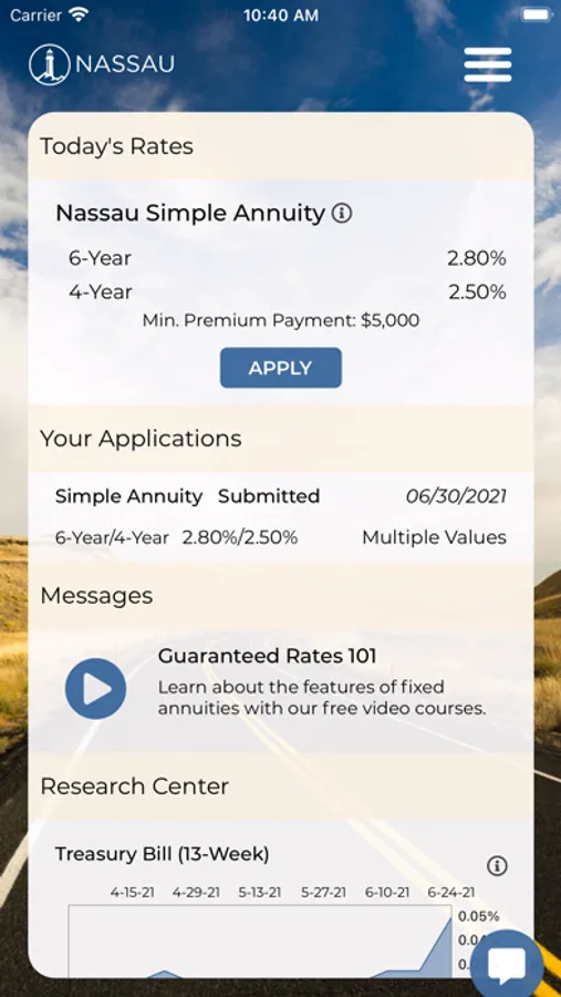 Nassau helps you easily save money and earn a fair interest rate in retirement. Track short and long-term interest rates. When the time is right, quickly apply for our fixed annuity. Nassau Simple Annuity offers guaranteed interest rates for a 4-year or 6-year period. Complete the application when you want. It takes 10 minutes or less. Manage your money the simple way — on your phone.