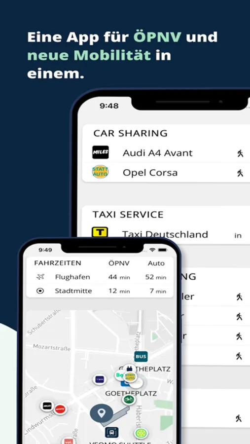 You will find all sort of options like public transportation (metro, train, bus, tram) or mobility solutions such as ride hailing, car sharing, bike sharing or scooter sharing, all at one glance. Besides the walking time to all of these different kind of services, we also provide a map view for you to visualize where all these services are.