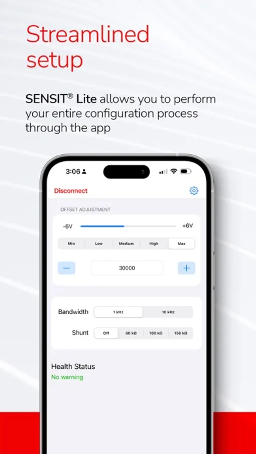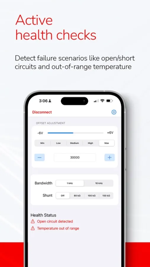 The app streamlines the entire calibration process and provides wireless control over crucial parameters such as bandwidth, gain, shunt, and offset/span. It also allows you to enable or disable features, and restore data with ease. The advanced failure detection capabilities are designed to alert you to potential failure scenarios before they escalate, such as open or short circuits of the bridge and out-of-range temperature readings, to ensure optimal performance at all times.