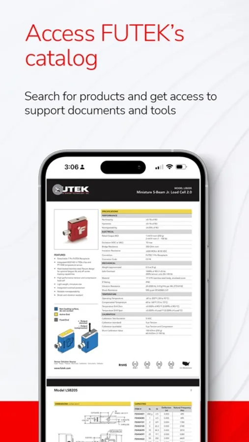 The SENSIT ® Lite app also offers a comprehensive product search feature, giving you access to an extensive range of FUTEK products. Find the perfect match for your needs and access spec sheets, support documents, tools, and troubleshooting guides. Download the app today to experience a new level of convenience and control.