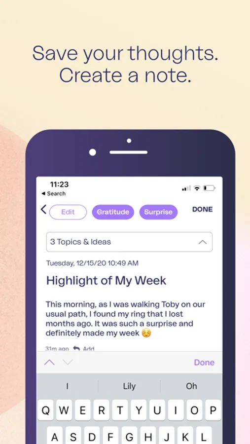 - A journal that you can add to by answering questions in conversations or writing on a blank canvas.