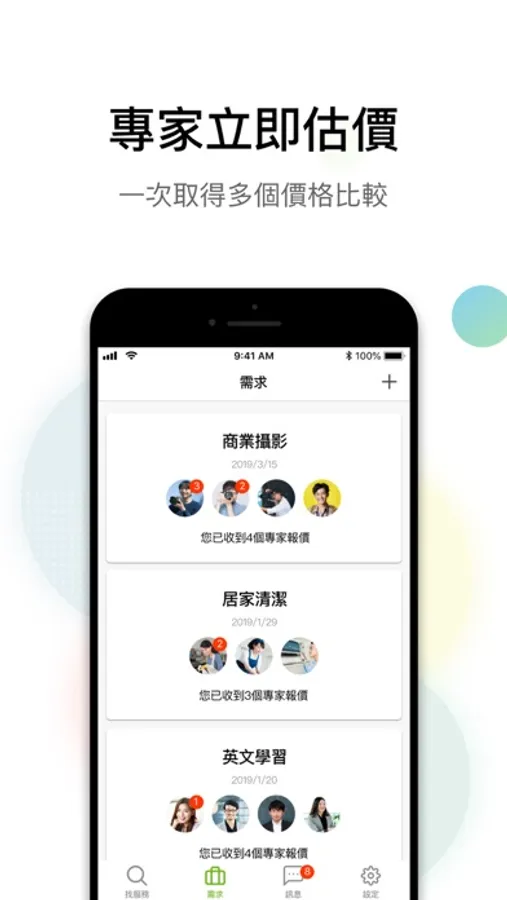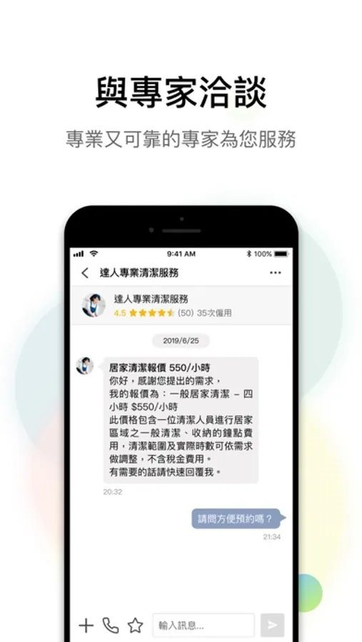 提出需求後,系統會即時提供您專家的估價通知,包含專家介紹、歷史評價與聯絡資訊等。您可以選擇直接聯繫專家,或透過平台訊息進一步提出問題並溝通相關細節,。