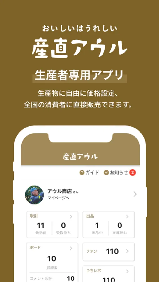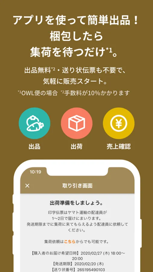配送会社を生産者様ご自身でお選び頂き短期間で販売が開始できる「自前配送」と受注後自動でお届け先が印字された伝票が届くお手軽な「アウル配送」。