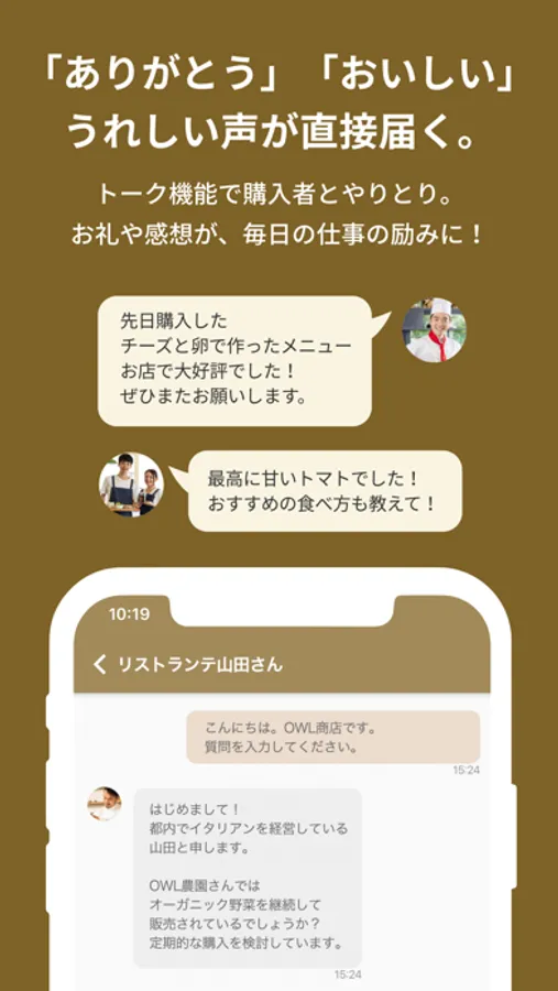 購入された商品の特徴やこだわり、美味しく食べるレシピを教えてあげることができたり、逆にユーザーから感想を直接いただいたりもできます。