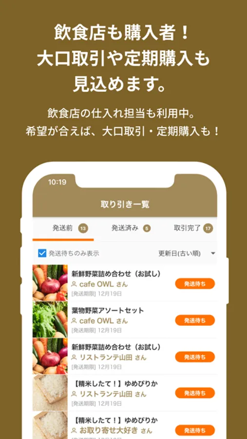 レストランや居酒屋などの飲食店も利用中。希望がマッチすれば、大口取引や定期購入も見込めます。