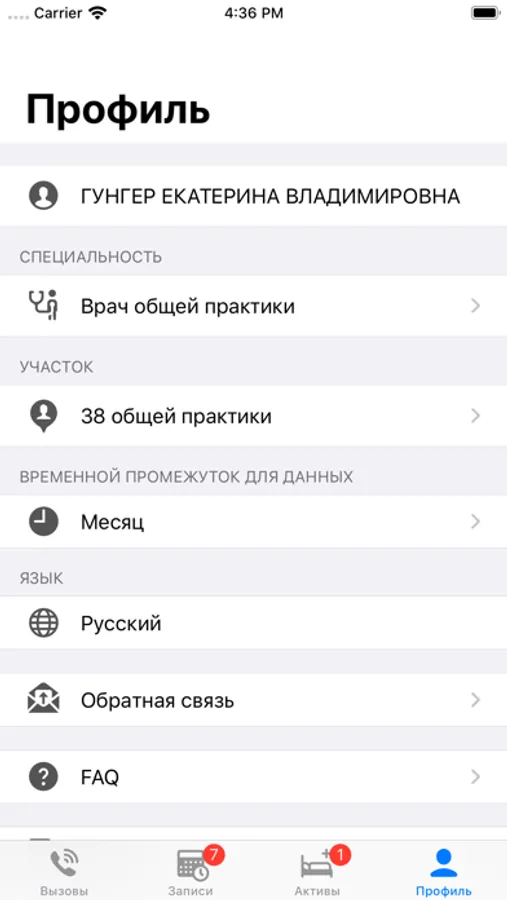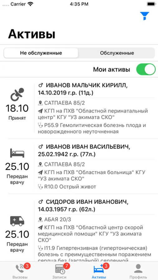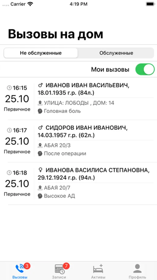 Возможность просмотра и обслуживания вызовов на дом, как своих, так и всей своей организации. Просмотр обслуженных и не обслуженных вызовов на дом. Возможность завершить осмотр непосредственно у пациента дома, обслуживая текущий вызов.