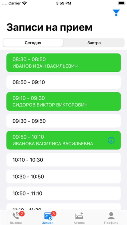 Просмотр сетки расписания своего графика (даже если график не один). Функционал «ЗАПИСИ» разработан для грамотного распоряжения врачом своего рабочего времени – оперативный доступ к просмотру свободного и занятого пациентами времени для своих графиков на сегодня и завтра.