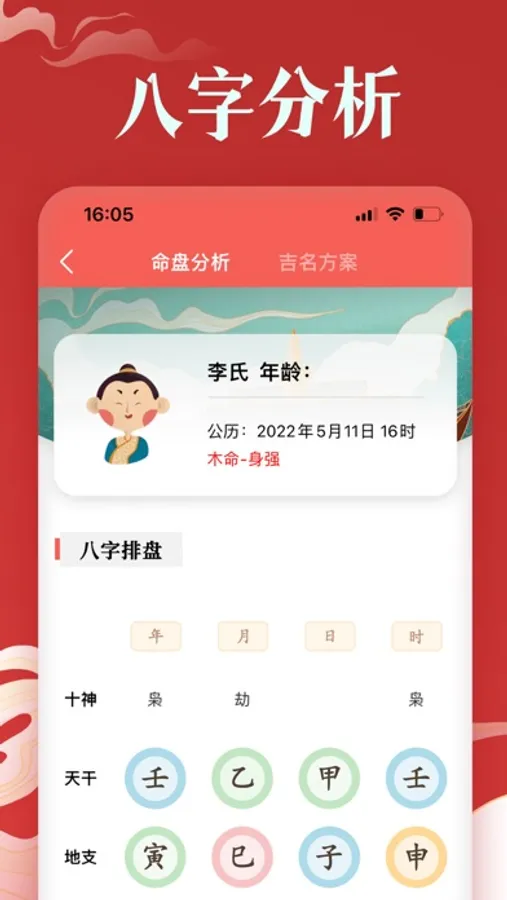 更有八字排盘、五行分析、财运测算、八字合婚、命中另一半、六道轮回、十年大运、每月运势等各种丰富功能等您来探寻!