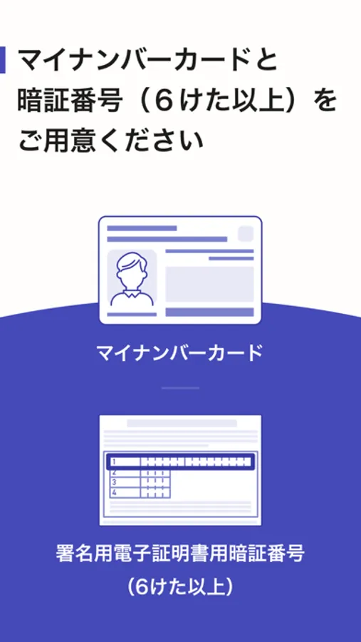 電子署名とは、マイナンバーカードを使用した本人確認です。自治体のWebサイトで申請に必要な内容を入力した後、このスマホアプリを使用して電子署名を行います。
