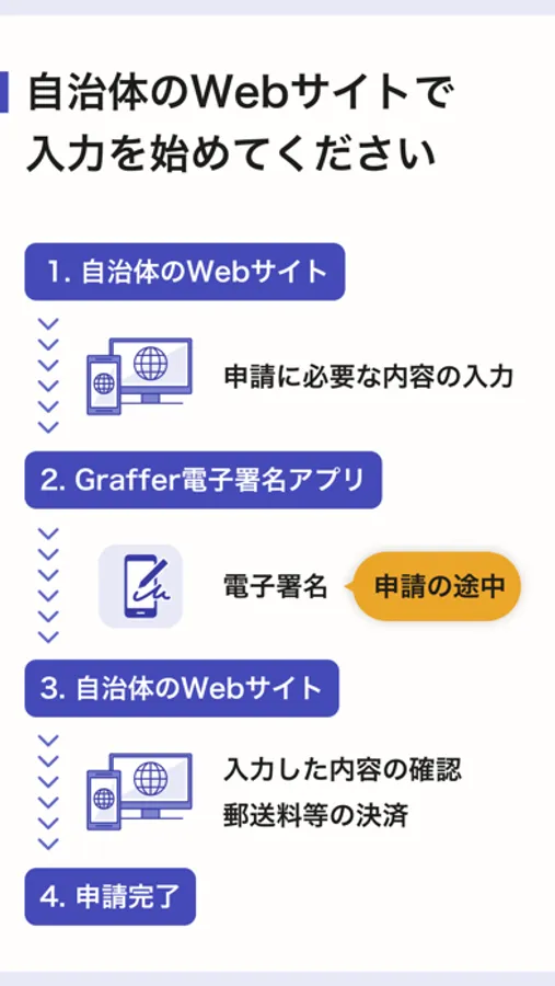 このアプリは、自治体のWebサイトで必要な情報を入力した後に電子署名を行うサービスです。正常に電子署名を行うためには、自治体のWebサイトで入力する際、推奨ブラウザを使用する必要があります。