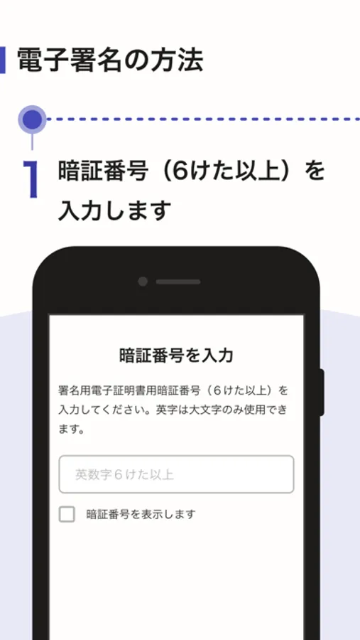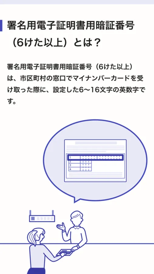 ・暗証番号(6けた以上):署名用電子証明書用暗証番号(6けた以上)は、市区町村の窓口でマイナンバーカードを受け取った際に、設定した6〜16文字の英数字です